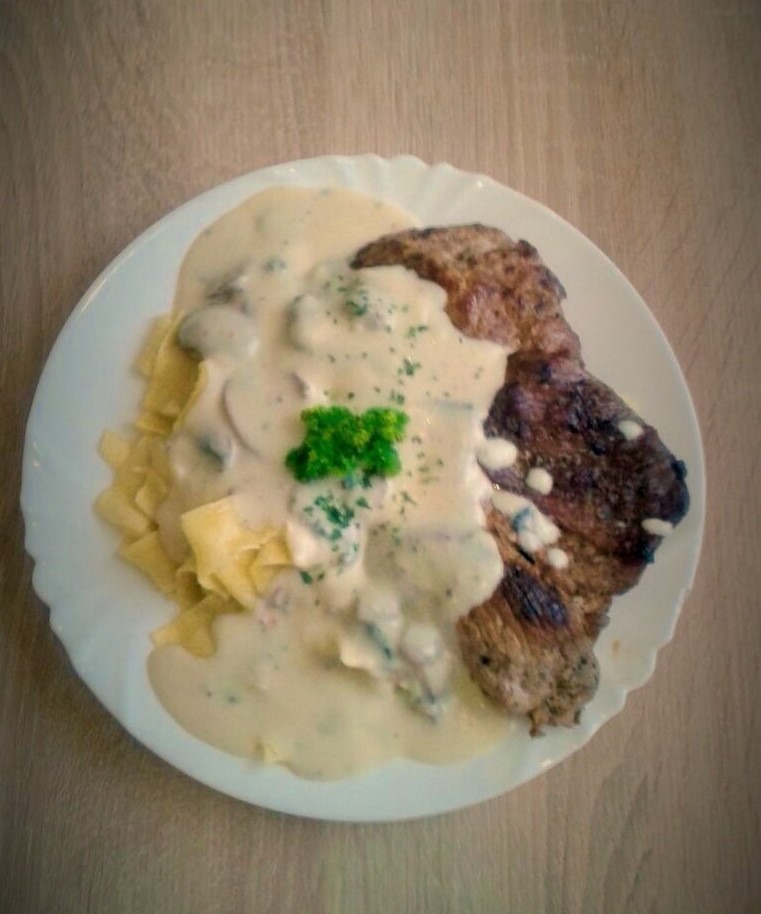Odrezak na žaru, u umaku od šampinjona, šunke, krastavaca i vrhnja sa prilogom -